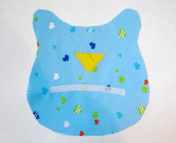 Выверните детали и проутюжьте их, набейте наполнителем. Сшейте отверстия зигзагом. Булавками прикрепите полученные детали к лицевой стороне передней части кота. Пришейте их к телу котенка зигзагом.