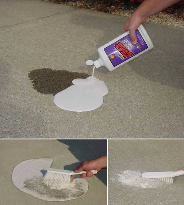С этой задачей удастся справиться только с помощью специального фирменного очистителя, который высыхает, приобретая порошковую консистенцию, поглощает нефть и как бы втягивает в себя пятно.
