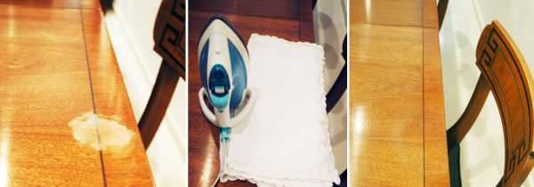 Если вы неудачно поставили на обеденный стол горячий чайник или сковородку, на этом месте обязательно останется белый след. Побороть его поможет плотная ткань, которую необходимо хорошенько намочить, разложить сверху и прогладить примерно в течение пятнадцати секунд.