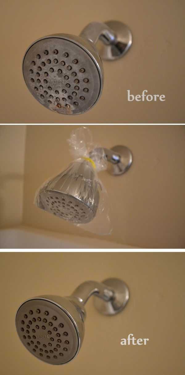 Очистить кран или насадку для душа от известкового налета поможет уксус. Налейте его в пластиковый пакет и с помощью резинки закрепите на головке душа. В течение часа весь налет бесследно исчезнет.
