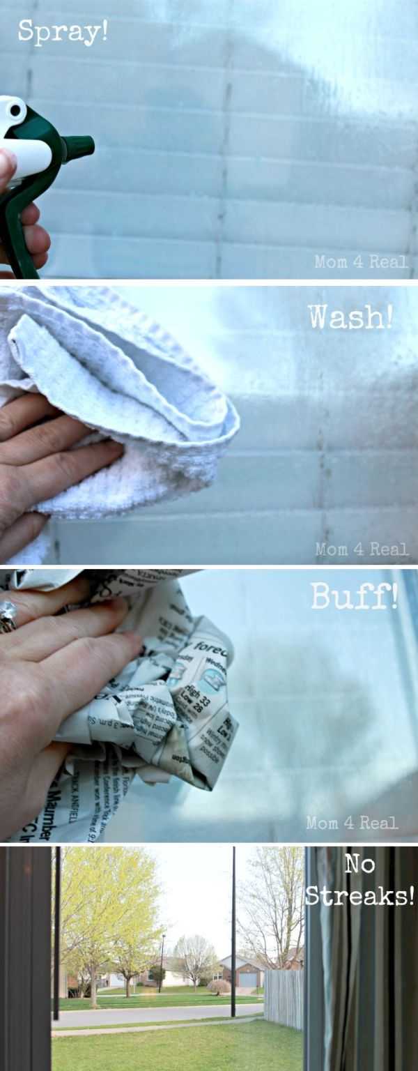 Всё, что вам нужно, чтобы на стёклах не оставались разводы, это вода, уксус и мыло. Объедините эти три ингредиента, опрыскайте окна, протрите их чистой, белой тканью, а затем высушите их газетным листом, чтобы придать блеск и идеальную прозрачность.