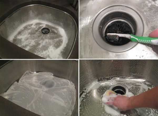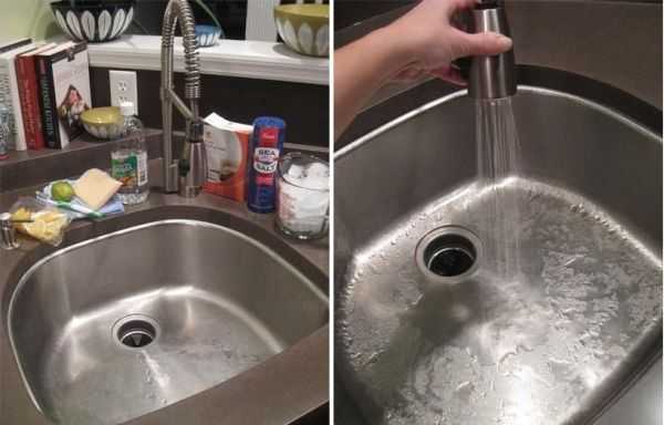 Прежде всего, следует обсыпать её содой и обложить бумажными салфетками, оставив их примерно на полчаса. Затем удалить их и промыть всё мыльным раствором, а сливное отверстие заполнить льдом и солью и направить туда струю холодной воды. Завершающим этапом станет спрыскивание лимонным соком.