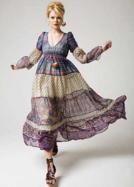 Самой распространенной одеждой для девушек представляются платья и сарафаны. Тонкие ткани и простой крой – основные составляющие женственного стиля. Как правило, это модели с отрезной расклешенной юбкой, свободным лифом, нередко с завышенной линией талии. Сверху надевают кардиган, кофту или жакет ручной вязки.