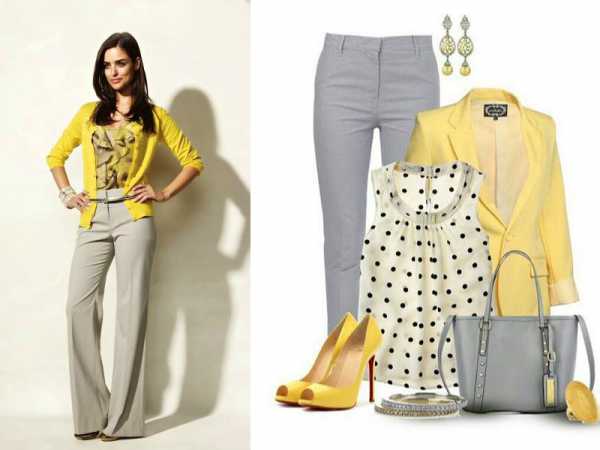 - С оттенками желтого. Серые того лучше всего сочетаются со спокойными оттенками желтого, но при создании молодежного образа, можно использовать и солнечные оттенки.