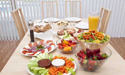 Хорошая привычка – сервируя стол для большого семейного обеда или ужина, использовать много ярких овощей, фруктов, ягод. Свежая морковь, сельдерей, перец, помидоры, зелень и фруктовый сок в кувшине украсят стол не хуже цветов. Чтобы не отвлекать внимание от этого великолепия, лучше не использовать цветных салфеток и подставок.