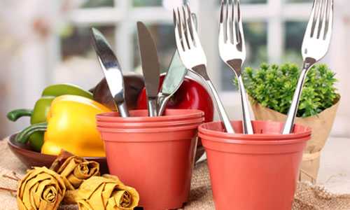 Нет возможности каждый день ставить на стол свежие цветы? Не беда – украсьте центр стола яркими подставками для столовых приборов, дополните искусственными цветами – красиво и практично.