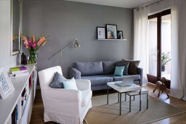 При таком варианте необходимо подобрать правильные оттенки серого, чтобы мебель не сливалась с цветом стен. Тут работает правило 3 полутонов. Проще говоря, разница цвета стен и обивки мебели должна быть немного, но заметна. Посмотрите, как это выглядит на следующих фотографиях.