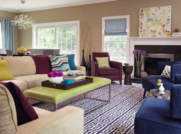 дополненный оранжевым, для строгой гостиной подойдет сочетание с черничным или