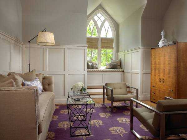 4. Интерьер в бежево-фиолетовых тонах очень выгодно смотрится. Беж немного гасит яркость фиолетового, но и слегка «припудривает» его. Сочетать можно бежевый с фиолетовым по-разному: равномерно, то есть интерьер заполняется двумя цветами в равной степени, а также основная масса достается бежевому. Фиолетового цвета могут быть детали, какие-то принты на текстиле, обивке, шторах, предметы мебели и аксессуары.