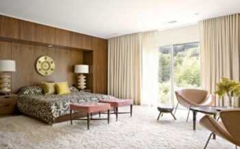 Красиво выглядят интерьерные варианты, где ковер лежит у места для сна или находится между кресел. Аналогичным образом можно заострять внимание на зоне отдыха.