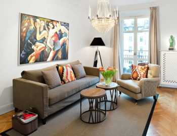 - Серый, слегка приглушенный цвет должен наблюдаться на полу, если в гостиной преобладают яркие тона. Это может быть как красочный рисунок на стенах, так и выделяющиеся шторы.