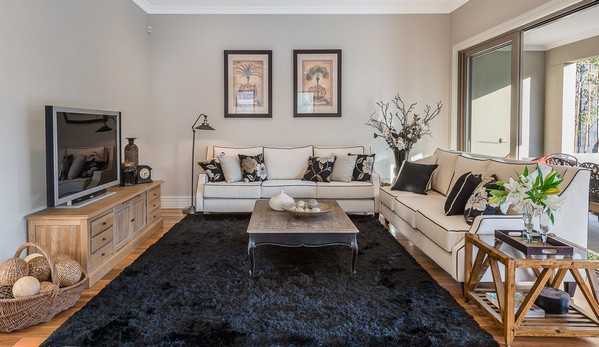 1. Под цвет мебели, которая будет располагаться на нем или возле него. Так, на сером ковре может стоять серый диван, а на синем ковре — обеденный стол с синими стульями.