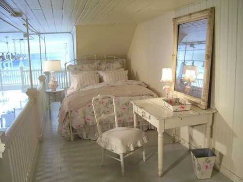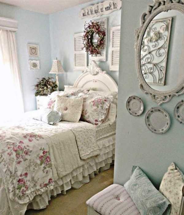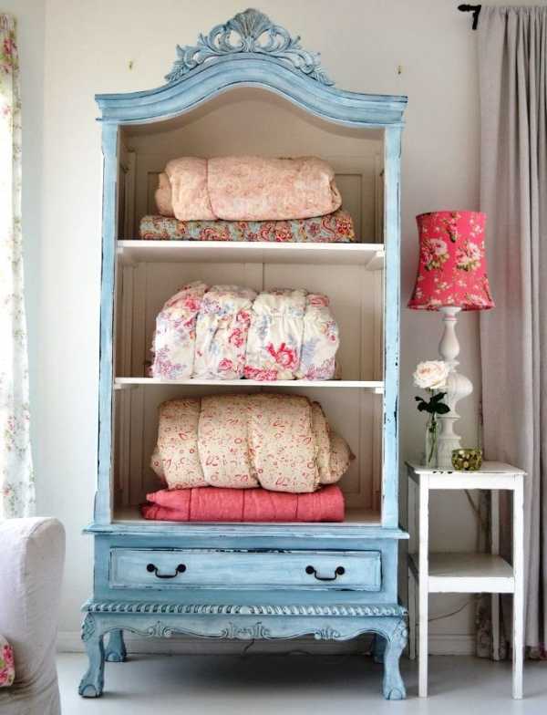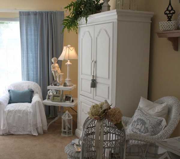 Вместо того, чтобы купить новое покрывало, достаньте старое, бабушкино, которое можно украсить, отремонтировать. Поиски в антикварных магазинах и на блошиных рынках увенчаются успехом. Забудьте о покупке новых комодов, тумбочек, шкафов, и стульев. Попробуйте найти старую антикварную мебель, которая будет дополнять интерьер. Старый шкаф или старинный стул не нарушат тонкости стиля. Не обязательно выбирать мебель светлого цвета, хорошо будут смотреться и другие оттенки. Подходят и связанные крючков белые салфетки — такие лежали на комодах у наших бабушек. Светлые или цветочные занавески, кованные вещи (подсвечники например)… многое можно собрать по родственникам и знакомым.