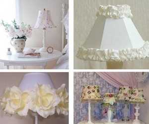 Ткань разрисованная, ткань фестончатая, ткань в сборочку, ткань с наклеенными “безумными розочками” – вот что подходит для светильника шебби шик.