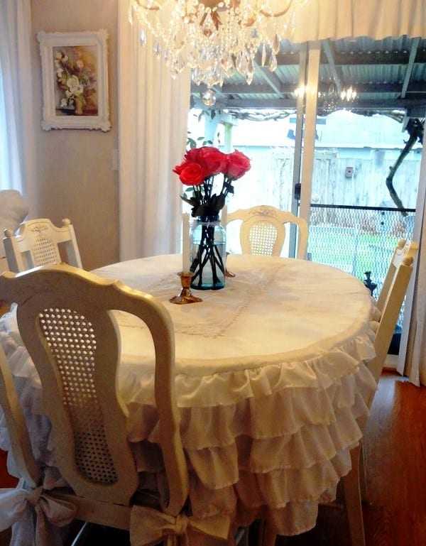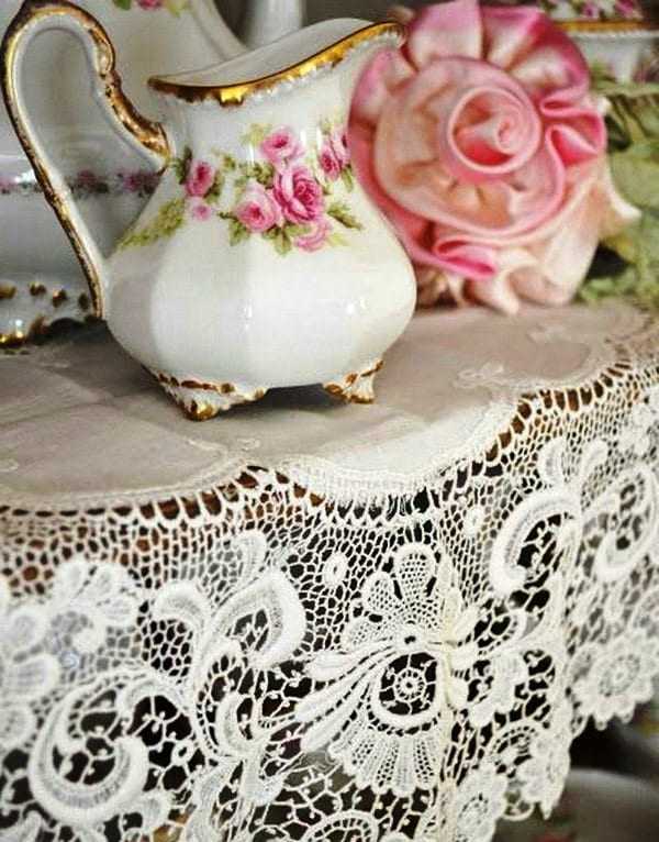 Стиль шебби шик в интерьере — это много различного текстиля. Дополните декор кружевными салфетками и скатертями. Их можно сделать из кружевной ткани или связать вручную.