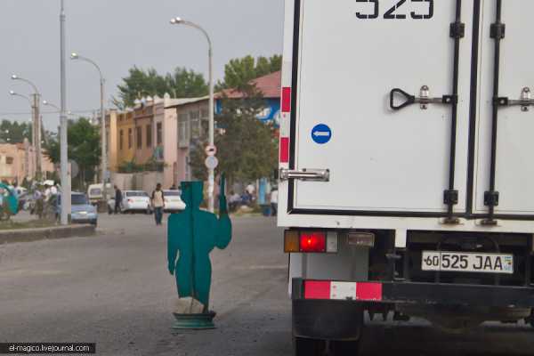 44. В ферганской долине на дорогах встречаются вот такие вот регулировщики. Этот к нам сейчас спиной. А по всему Узбекистану вдоль дорог можно увидеть картонные автомобили полицейских.