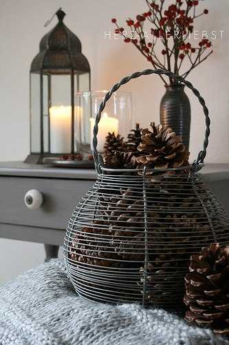 Пожалуй, самый «реактивный» способ украсить дом с помощью шишек – это выложить их в емкость и декорировать веточками со светящимися гирляндами. Такая картинка будет выглядеть по-настоящему натурально и естественно.8. Вместо игрушек