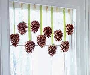 Если есть возможность и желание из небольших шишек можно сделать гирлянды, или небольшие шторы для кухни или для окон, для этого стоит взять шишки, проколоть их с помощью шила и нанизать на леску или на декоративную веревочку.