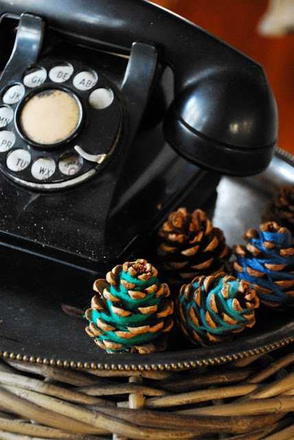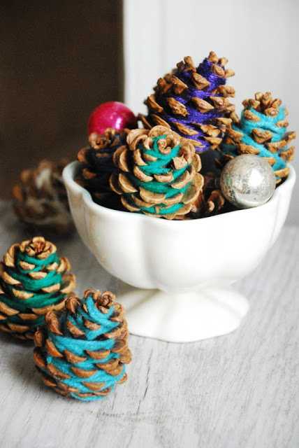 Очень простой способ быстро и ярко преобразить обычные шишки – оплести их пряжей. Подобрав любимые цвета, вам останется лишь потратить немного времени на создание такого чуда. Но все же рекомендуется прибегать к использованию более традиционной цветовой гаммы – синим, голубым, белым, фиолетовым, красным и зеленым оттенкам.