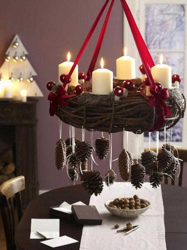 Шишки можно повесить на люстру, будет красиво и необычно смотреться, главное – по — зимнему.