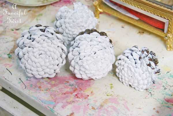 Во время покраски мне пришла в голову идея, что необязательно оставлять верхушки шишек заостренными. При помощи кусачек можно удалить несколько лепестков соснового конуса и открыть стебель, как показано ниже.