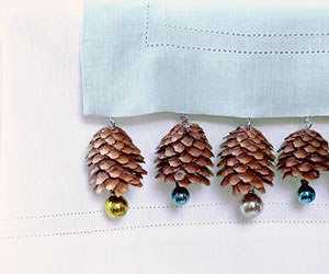 Довольно простой способ создать в доме новогоднее настроение – преобразить праздничный стол, просто разложив на нем шишки в компании с хвойными веточками и ягодами. Также можно поместить одну прямо возле столовых приборов и вставить в нее записку с поздравлением или другим посланием.2. Гирлянды из шишек