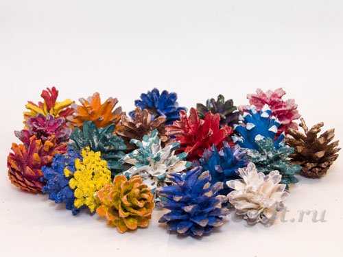 Цвета и оттенки вы можете выбрать какие угодно. А если покрасить основу шишек сначала белой краской и дать ей высохнуть перед нанесением других цветов, шишки будет выглядеть еще красочнее.