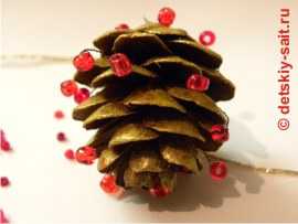 3. Теперь нам пригодятся проволока и — сделаем из них своеобразную гирлянду (смотрите фото). Гирлянда делается на одной проволоке, и ее длина зависит от размера шишки (чем крупней шишка, тем длинней гирлянда).