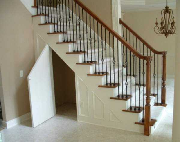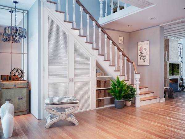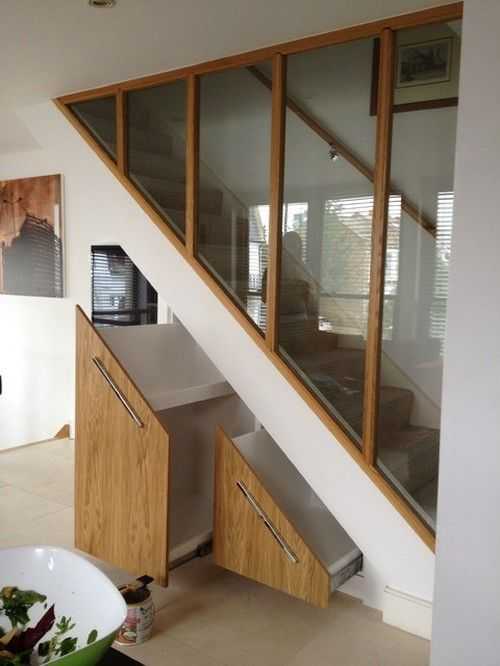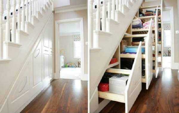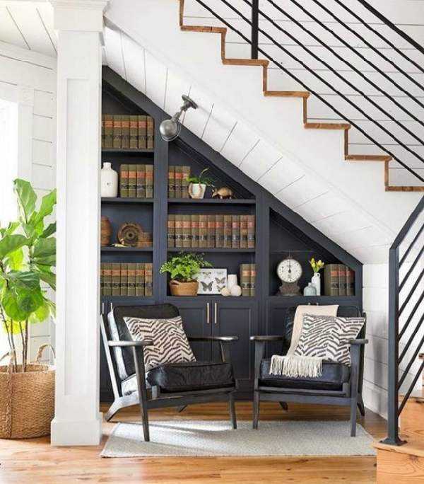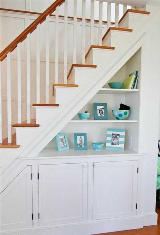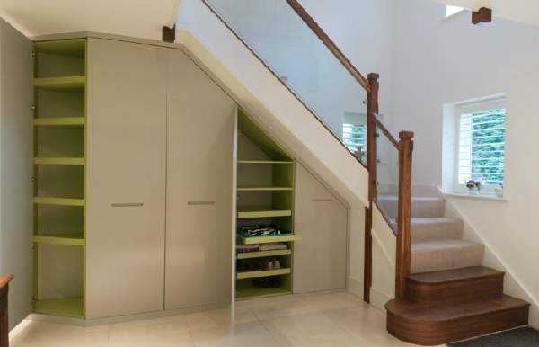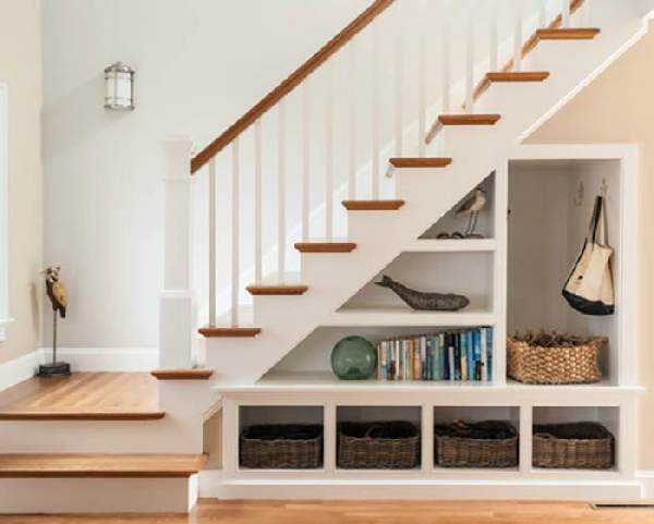 Если, например, лестница ведет из полуподвального помещения, либо вы планируете использовать подлестничное место в доме для хранения книг, фотографий в рамках и памятных сувениров.