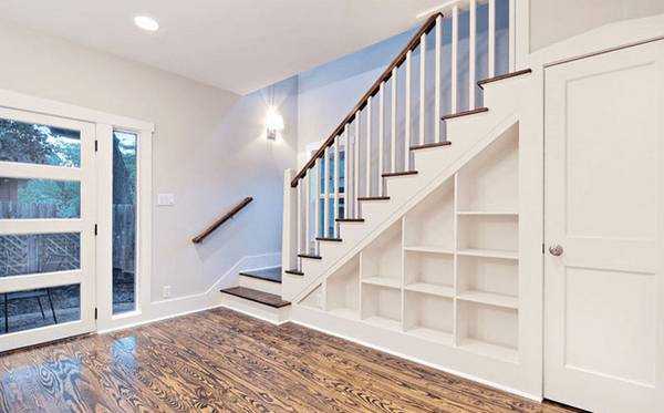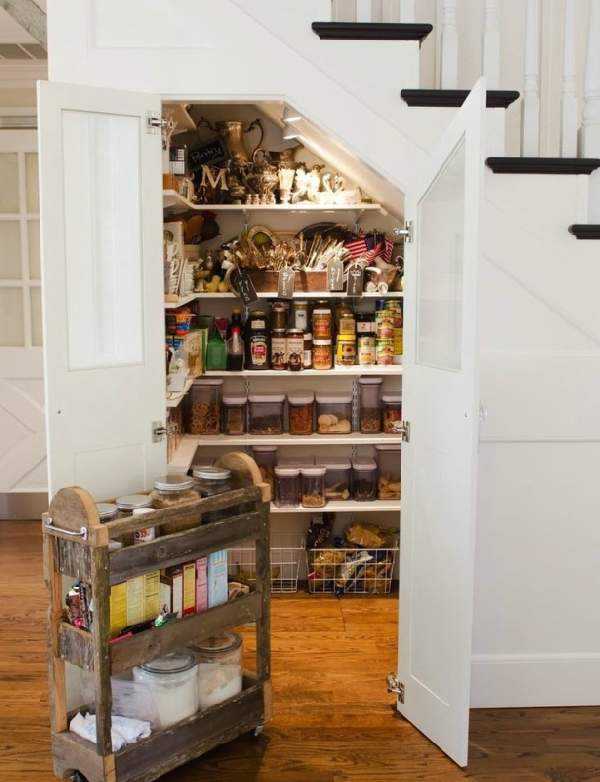 Проблема в том, что никогда не хватает места. У вас есть свободное пространство под лестницей? Подумайте, как его лучше использовать. Это может быть что угодно – от небольшой комнаты, до кладовки или встроенного шкафа. В общем, вариантов много, но главная задача, это сделать дверь. Только будьте осторожны с потенциальными проводами или сантехникой, которые могут находиться в стене. Дверь можно оформить в виде навесного шкафчика с полками.