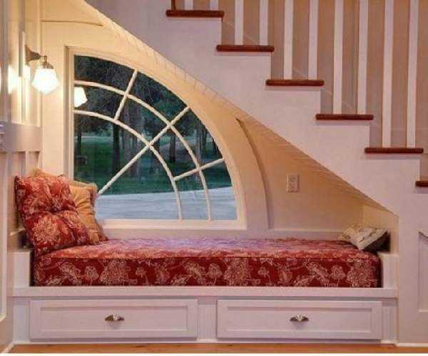 Диван под лестницей и несколько полок для любимых книг – прекрасный вариант зоны отдыха.