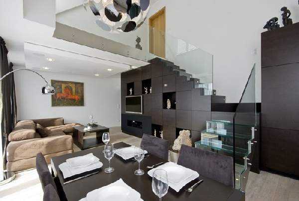 Под лестницей можно разместить кухонную или обеденную зону, а область под ступенями конструкции отлично подойдет для встраивания многочисленных шкафчиков, без которых на кухне никак не обойтись.