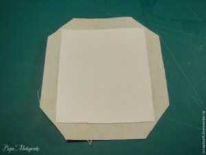 Делаем уголки с минимальным утолщением, подрезаем ткань вдоль картона, не доходя до угла 2мм. После того, как сформировали все четыре уголка, приклеиваем припуски на короткие стороны.