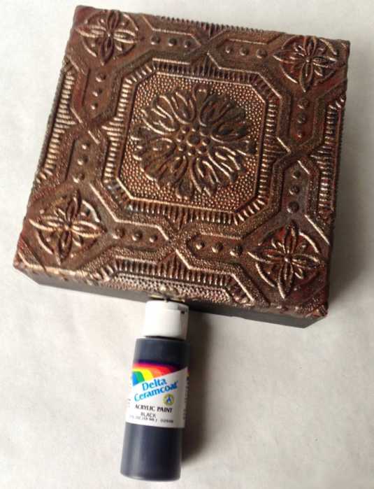 Далее, даём клею высохнуть и только потом красим шкатулку и придаём ей вид металла, состаренного временем. Для того чтобы наносить краску на поверхность, используются одноразовые бумажные полотенца, смоченные в воде. Нам нужно, чтобы краска легла неравномерно и неправильными островками. Для начала покрываем поверхность шкатулки чёрной акриловой краской. У нас она в баллончике, но может быть и в банке.