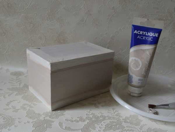 Окрашиваем все стороны шкатулки любой светлой акриловой краской. Таким образом делаем нижний слой под имитацию ткани.