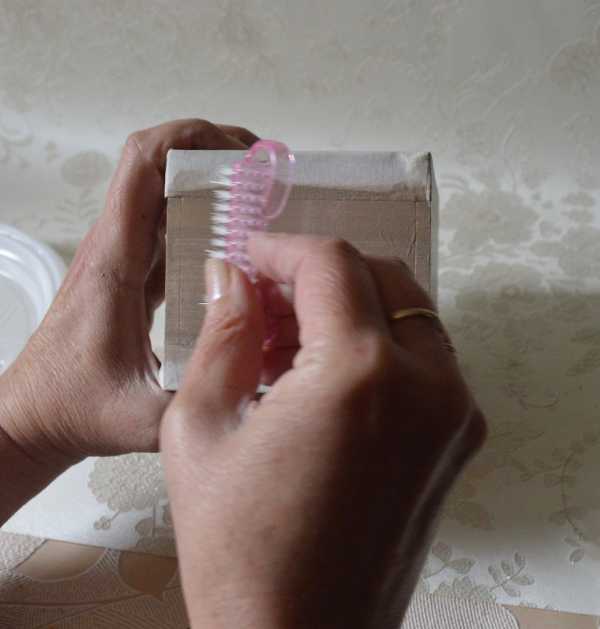 Слой лака нам нужен был для того, чтобы краска не впиталась в поверхность изделия. Если бы не лак, то такой фактурной поверхности мы бы не получили. Также поступаем со всеми боковыми поверхностями шкатулки: красим и стираем краску губкой или щёткой. Будет замечательно, если вы нанесёте сверху лак. Ждём, когда изделие подсохнет, на мокрую кисть набираем ту же краску и красим боковые части, но уже вертикально. Стираем краску губкой вертикально. В итоге у нас должна получиться «ткань».