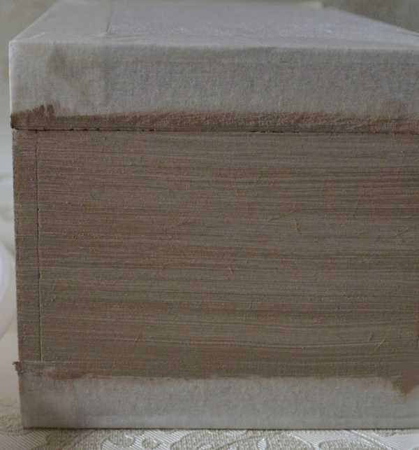 Далее, ошкуриваем боковые стороны после того, как поверхность подсохнет. Для завершения работы можно покрыть стороны изделия несколькими слоями лака. Пришла пора заняться крышкой. Наклеиваем на боковины крышки полоски малярного скотча. Окрашиваем крышку в том же порядке, что и боковые стороны. Сначала светлый цвет, под «ткань», лакируем. Затем сама «ткань»: красим кистью горизонтально, потом вертикально.