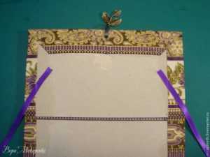 Отрежьте две ленты длиной 14 см и симметрично под углом приклеиваем к обложке. На расстоянии 1 см от края они должны быть свободны. Остальная часть приклеена.
