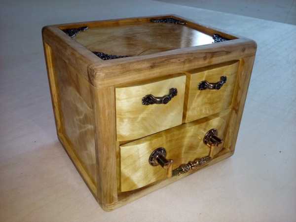 Современная шкатулка для украшений из дерева – это уже более тяжелый и затратный процесс. Тут надо не только карандаши, линейки, но и специально вымеренные дощечки из сосны или липы, которые подойдут в качестве днища, крышечки и боков. Поможет вам в работе электролобзик, нож, небольшая пила, наждачная бумага и клеящий элемент.