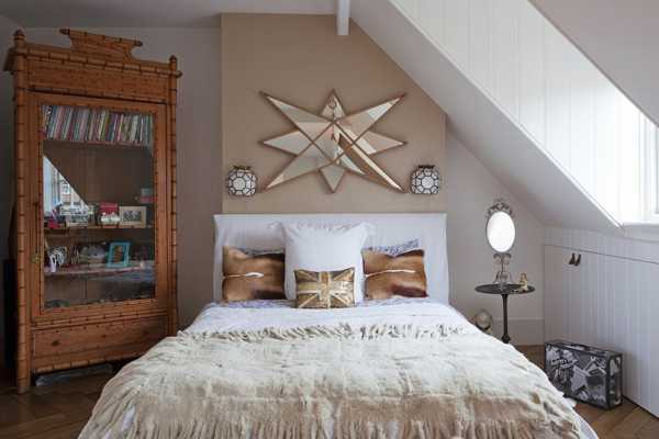 - В спальне в стиле деревенского интерьера хорошо будет смотреться покрывало (плед) из шерсти ламы или норки с одной стороны и ткани (например, шелка, хлопка) с другой. Здесь же можно расположить и ковер, который сшит из кусочков шкур, создающих интересный узор.