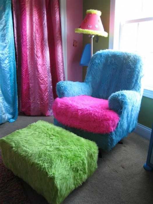 Накидка, сделанная своими руками из искусственного меха, – прекрасный способ украсить, обновить и преобразить мебель, сделав её мягкой и очень приятной на ощупь. Разнообразие цветов и длины ворса позволяет выбрать мех по своему вкусу, чтобы он не казался слишком кричащим. Ну, а как приятно после трудового дня упасть в такое утопающе-мягкое кресло и отдохнуть с книгой или шитьём в руках! Давайте попробуем повторить это в своём доме. Для МК специально был использован мех контрастных цветов (синий, розовый, зелёный) – вы можете выбрать вариант, который вам ближе.