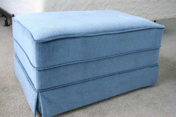 1. Положите на пуф искусственный мех ворсом вниз, по краям зафиксируйте булавками или быстро сшейте иголкой. Затем просто снимите мех, отрежьте ненужную часть и прострочите несколько раз на машинке края.