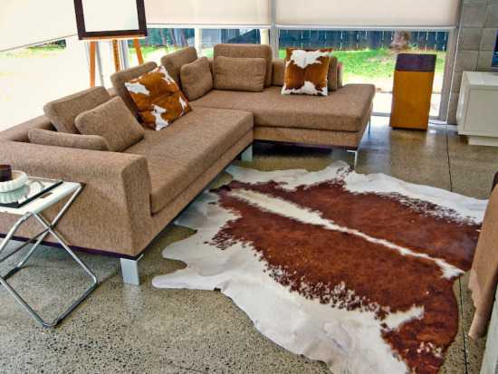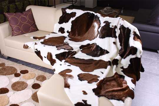 Однако меха попроще могут украшать и другие комнаты, например, гостиную. Коровьи шкуры выглядят очень красиво, к тому же хорошо поддаются окраске.