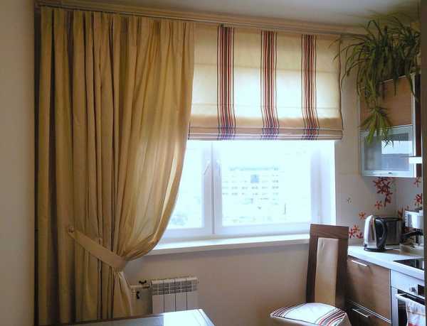 Другой вариант: рулонные или римские шторы дополнены односторонней гардиной. Эффектный карниз и гармоничное цветовое решение делают оформление оконного проема стильным и эффектным.