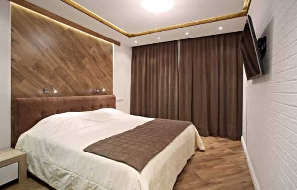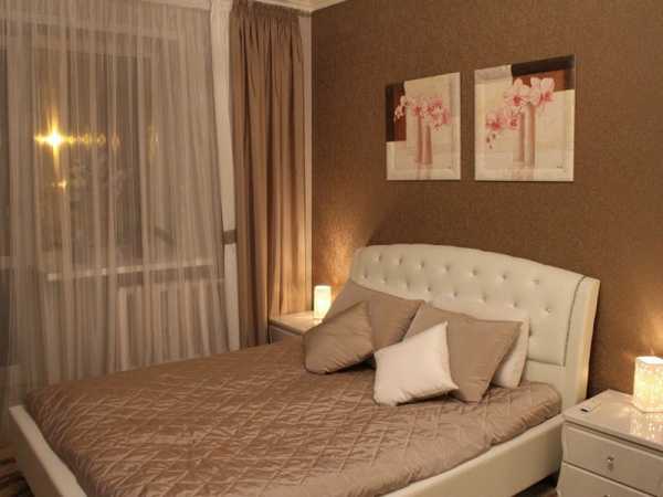 В темную спальню стоит подбирать цвет штор в тон стен, или другого светлого оттенка. Для коричневой спальни подойдут молочные оттенки, бежевый, песочный, ванильный, шоколадный, кофейный.