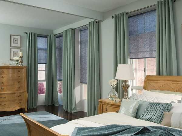 На фото серо-зеленый интерьер с двойными шторами и тюлем, которые подходят под цвет изголовья кровати.