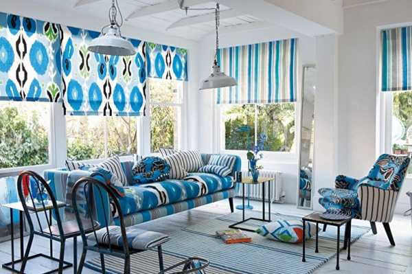 Синие шторы охлаждают жаркую комнату солнечной стороны, настраивают на отдых, сочетаются с другими оттенками синего, голубым, желтым, белым цветом.