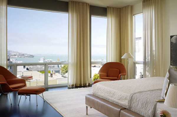 Спальни, которые не обладают внушительным количеством квадратных метров, а таких в наших домах большинство, очень требовательны по отношению к оконному дизайну. Шторы в таком случае не должны препятствовать проникновению естественного света, но ответственно выполнять миссию перегородки между внутренним и внешним миром.