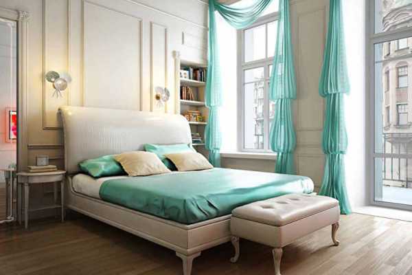 Бирюзовые занавеси в спальне выглядят легко, подходят для невесомых тканей, сочетаются с белым, черным, желтым, розовым, золотым цветом.