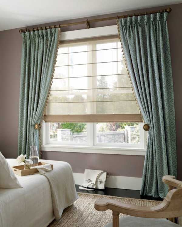 Хорошо подойдут классические шторы, ярким акцентом которых является цвет, а также интересный рисунок. Римские, японские виды впишутся в комбинации с длинной гардиной другого оттенка.